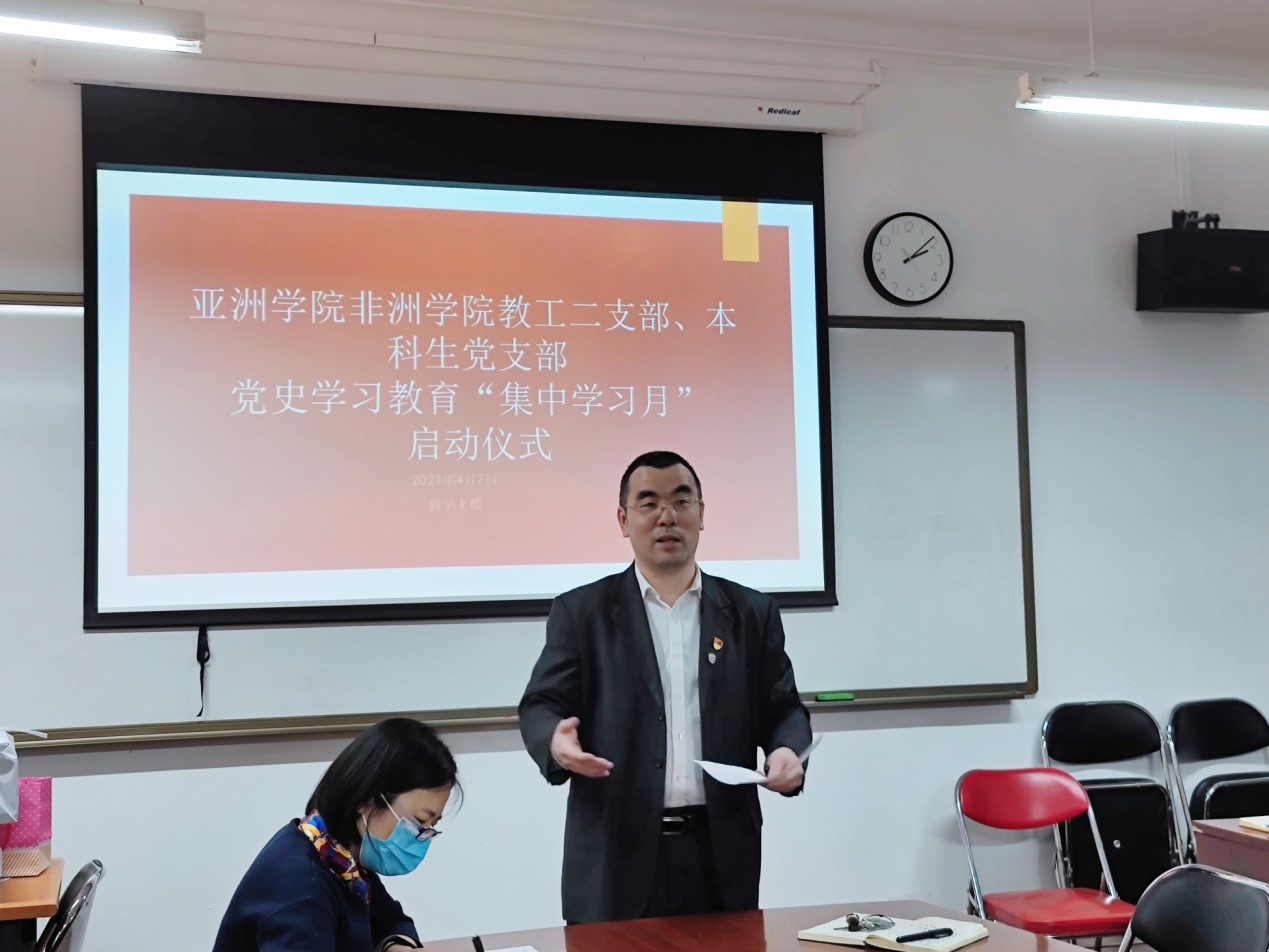 2021年4月7日,pg游戏电子模拟器、非洲学院党总支举办党史学习教育“集中学习月”启动仪式暨第一次集中学习活动。党总支书记许晔、非洲学院院长李洪峰、教工二支部及本科生支部三十多名同志参加了主会场活动。教工一支部、研究生党支部在各自的分会场开展学习。