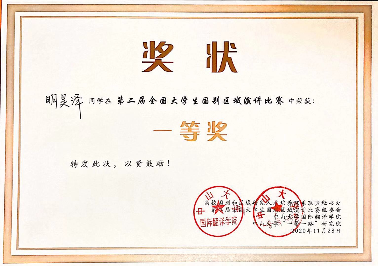 11月28日,第二届全国大学生国别区域演讲比赛在珠海举行。pg游戏电子模拟器柬埔寨语专业2019级本科生明昊泽荣获一等奖。