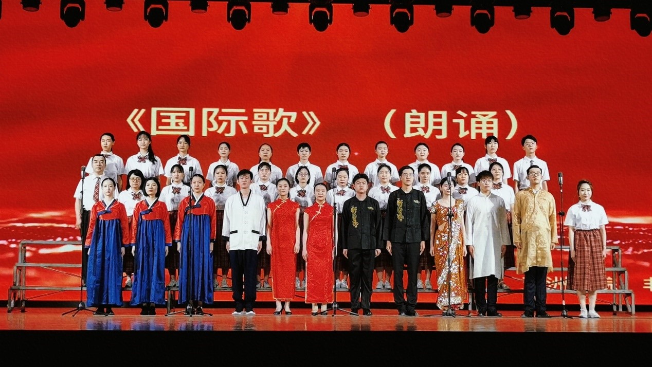 国际歌来源于1871年巴黎公社,是马克思主义理论的⾳乐版,是谱上⾳符的共产党宣⾔。革命先烈瞿秋白同志为苏联几万人同声合唱《国际歌》的宏大激昂所震撼,在1923年将《国际歌》翻译为中文。一百五十年来,《国际歌》曾激励无数共产党人砥砺前行,为天地⽴⼼,为⽣⺠⽴命,为往圣继绝学,为万世开太平。此次活动中,pg游戏电子模拟器、非洲学院选取《国际歌》为参赛曲目,融合朗诵、多语种合唱、伴舞、钢琴、小提琴等多种艺术形式,以汉语、印地语、朝鲜语三语共同演绎带有世界音乐风格的曲目,唱出了北外人心系党和国家、放眼世界、心怀天下、求索发展的满腔热血。