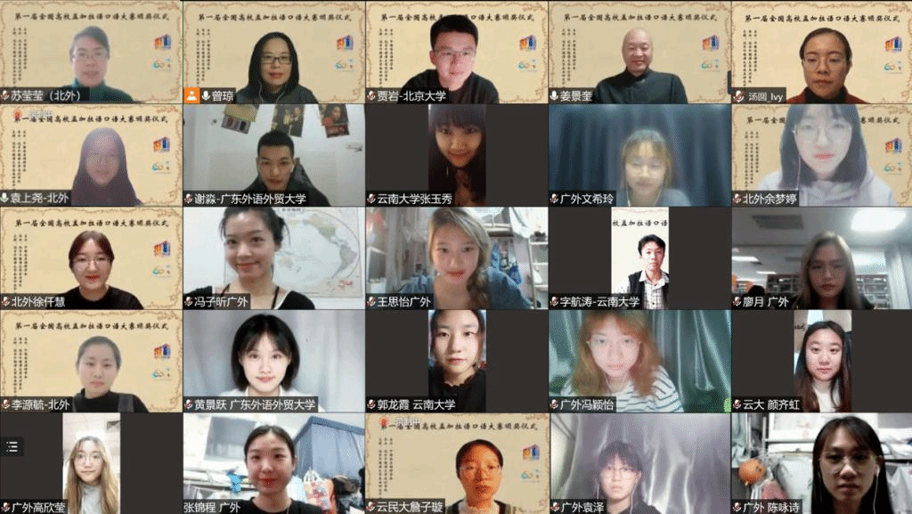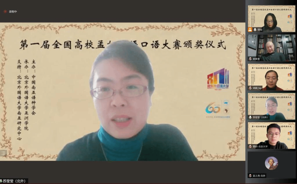 2021年10月29日晚,“第一届全国高校孟加拉语专业口语大赛”颁奖仪式以线上形式举行。孟加拉国驻华大使为发来祝贺视频,中国南亚语种学会会长、教育部高校外指委副主任委员、非通用语分指委主任委员、北京大学南亚研究中心主任姜景奎教授,pg游戏电子模拟器院长苏莹莹教授出席仪式并致辞,中央广播电视总台孟加拉语部于广悦主任发来贺词。出席颁奖仪式的还有中国南亚语种学会秘书长、北京大学外国语学院助理教授贾岩博士,pg游戏电子模拟器、广东外语外贸大学、云南民族大学、云南大学孟加拉语专业师生共计50余人。颁奖仪式由pg游戏电子模拟器孟加拉语教研室主任曾琼教授主持。