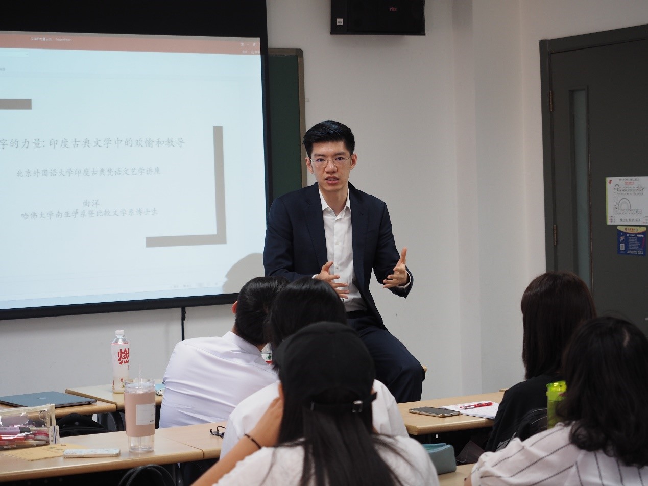 整场讲座深入浅出,气氛活跃。曲洋博士以清晰的图表、生动的现代案例、活泼的语言,介绍了梵语文学批评理论。他与在场师生热烈互动,鼓励大家用梵语诗学理论对《摩诃婆罗多》、《罗摩衍那》等耳熟能详的史诗进行文学评论实践。讲座梳理了梵语文学评论理论的流变,介绍了梵文诗学的目的论,展示了梵语文学的最新研究成果,大大拓宽了听众的学术视野,激发了广大师生对印度文学的研究兴趣。