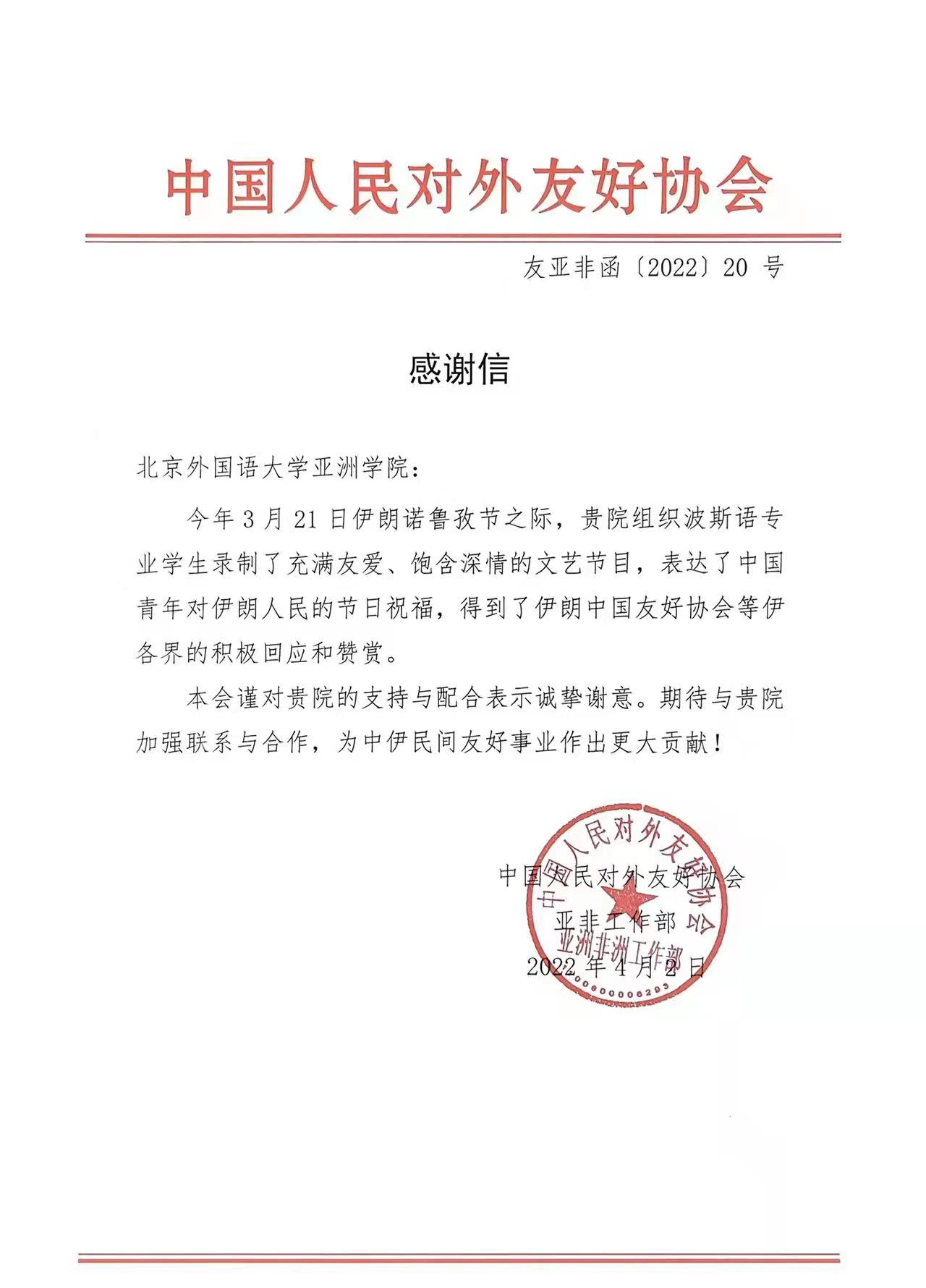 2022年4月2日,中国人民对外友好协会向pg游戏电子模拟器发来感谢信,对我院组织波斯语专业学生录制文艺节目一事表示诚挚谢意。