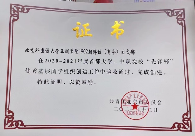 2022年3月,2020-2021年度首都大学、中职院校“先锋杯”优秀基层团学组织创建工作落下帷幕。经过前期创建、中期汇报、总结验收三个阶段,pg游戏电子模拟器1902朝鲜语(商务)团支部建设特色鲜明、成绩突出,获评2020-2021年度首都大学、中职院校“先锋杯”优秀基层团支部。
