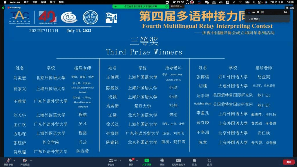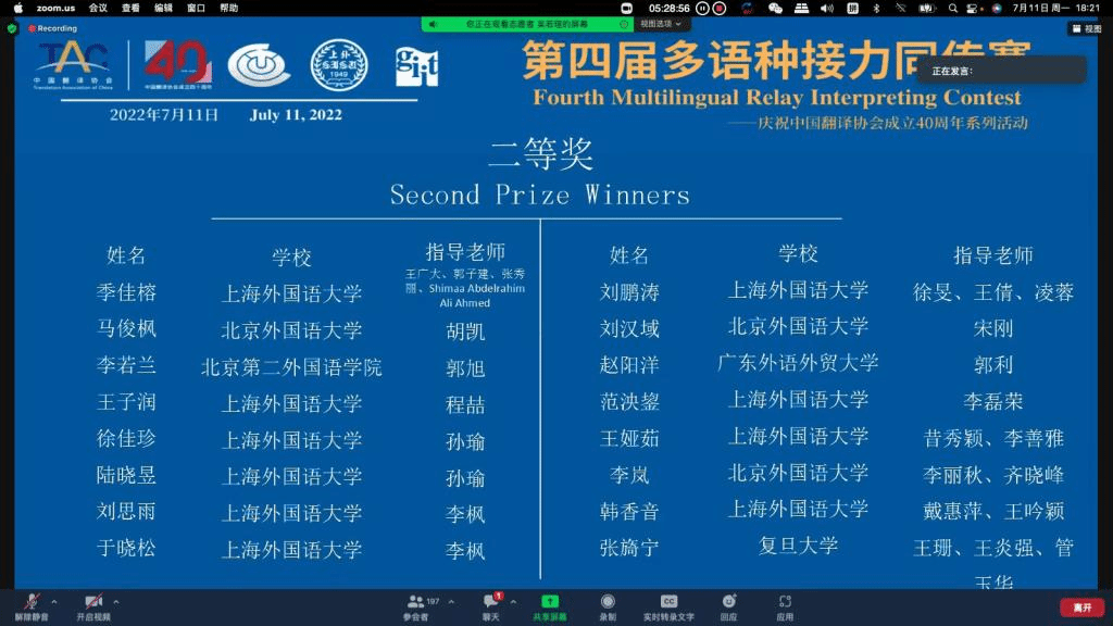 2022年7月11日,由上海外国语大学主办,中国翻译协会(口译委员会)和国际大学翻译学院联合会亚太办公室指导的第四届多语种接力同传赛决赛阶段比赛圆满落幕。pg游戏官网pg游戏电子模拟器朝鲜语专业2021级朝鲜语口译方向硕士生李岚、王嘉源在朝鲜(韩)语组比赛中发挥出色,最终分获二、三等奖。