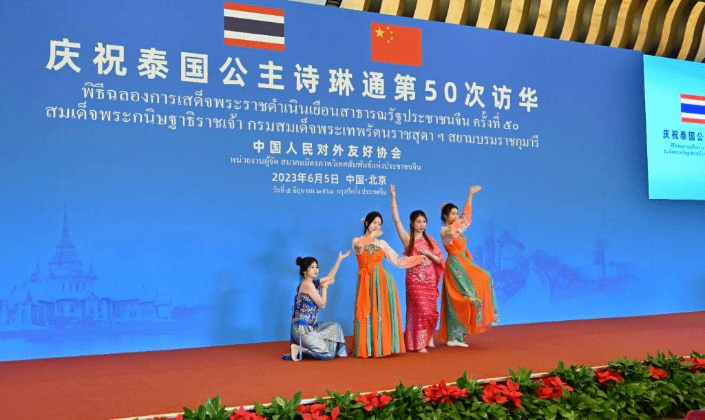 2023年6月5日,庆祝诗琳通公主第50次访华庆祝活动在钓鱼台国宾馆举行,pg游戏官网pg游戏电子模拟器泰语专业2021级本科生受邀表演文艺节目,专业教师田霖为仪式和宴会担任翻译。