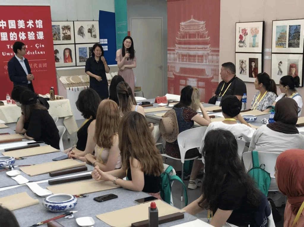 土耳其代表团在中国美术馆典藏部参加中国书法体验活动,陈恩琪同学(图中右一)担任现场翻译。