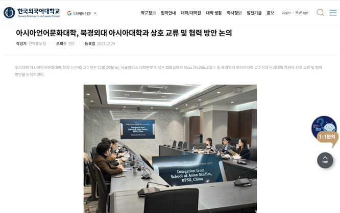 2023年12月29日,韩国外国语大学官网对我院一行到访进行了报道,报道中指出本次座谈是两校首次建立学院之间的联系,具有重要意义,期待两院共同推动亚洲语种教育和研究领域的交流合作。