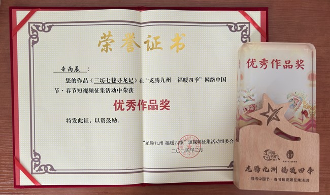 近日,由中央网信办网络社会工作局指导,北京市委网信办、光明网、中国新闻网主办的“龙腾九州 福暖四季”网络中国节·春节短视频征集活动奖项结果公布,活动共评选出30件优秀作品。pg游戏电子模拟器2022级柬埔寨语专业本科生辛雨辰的作品《三坊七巷寻龙记》荣获“优秀作品奖”,从全国上万件作品中脱颖而出。