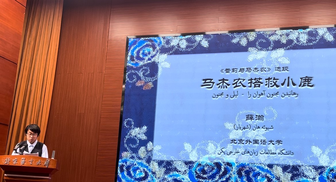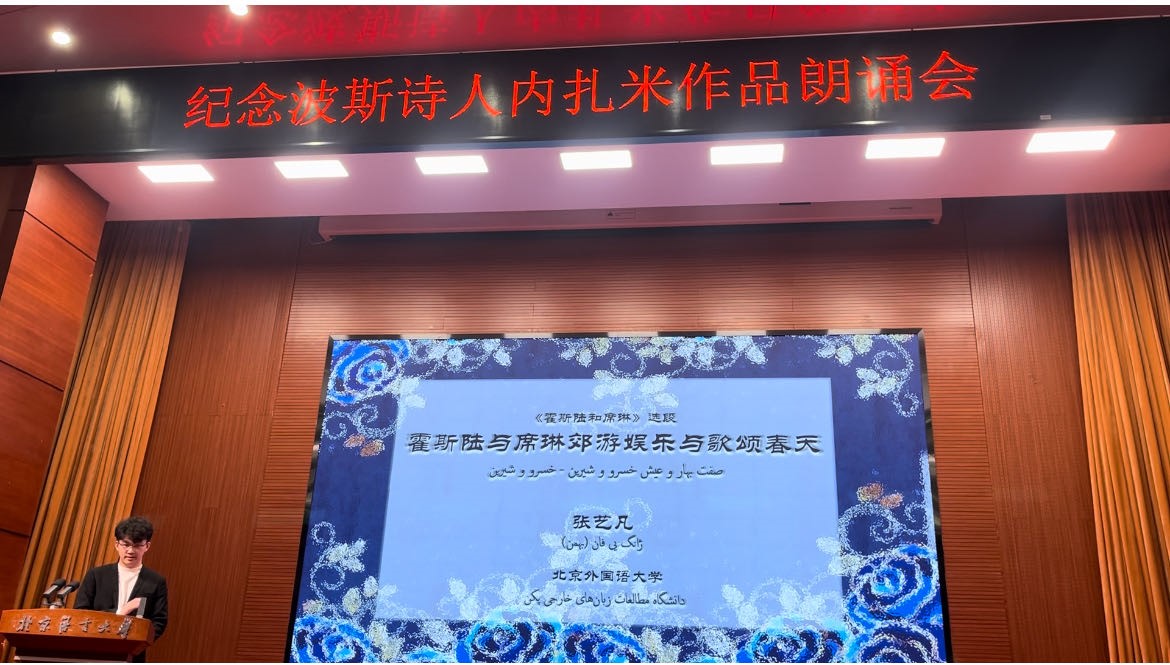 接着来自各大高校的学生代表朗诵了内扎米诗集选段。pg游戏官网pg游戏电子模拟器波斯语专业本科生张艺凡、地区研究专业研究生薛瀚作为代表参加了本次朗诵会,张艺凡同学朗诵了《霍斯陆和席琳》选段《霍斯陆与席琳郊游娱乐与歌颂春天》,薛瀚同学朗诵了《蕾莉与马杰农》选段《马杰农搭救小鹿》。两位同学熟练的朗读得到了全场的肯定与热烈的掌声,出色地展示了pg游戏官网高水平、高质量波斯语教学的成果。