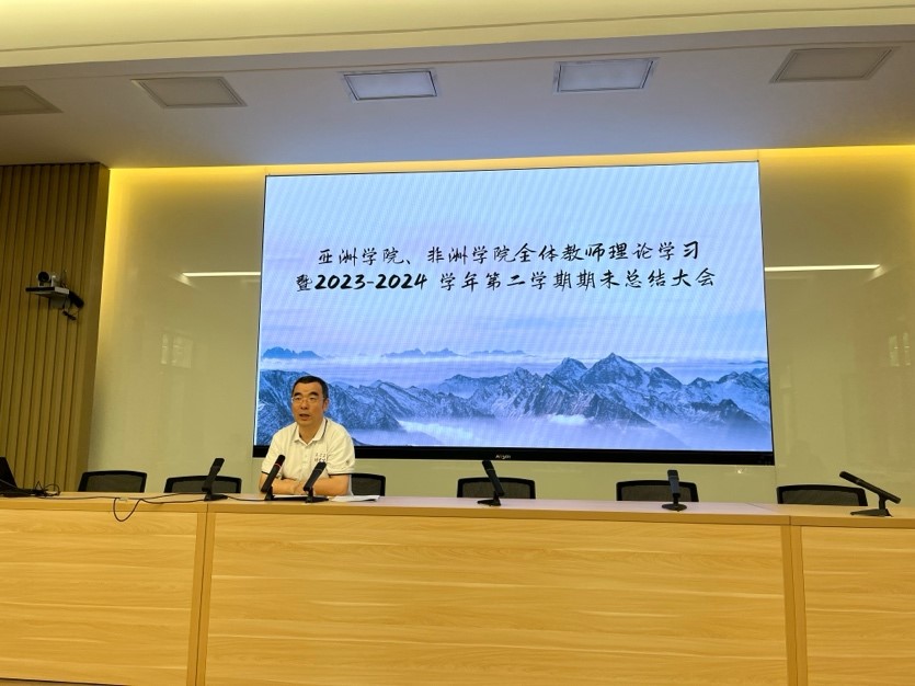 最后,苏莹莹院长对本学期学院工作进行总结发言。她指出,早在2014年,学院就站在学科发展的前沿,在国内高校中率先自设“亚非地区研究”二级学科,着手进行人才培养工作,与具有60多年发展历史的“亚非语言文学”二级学科相互助力,共同发展,致力于培养外语精湛,并能用所学外语深入研究对象国及其所处区域,在各领域高质量推动中国对外交流的亚洲非通用语高端人才。希望学院全体教职工能够坚守教育的初心,团结一心,共同努力,为学院的学科建设和专业发展贡献更多的力量。最后,她代表学院感谢学院全体教师与行政团队一直以来的辛勤付出与共同努力。