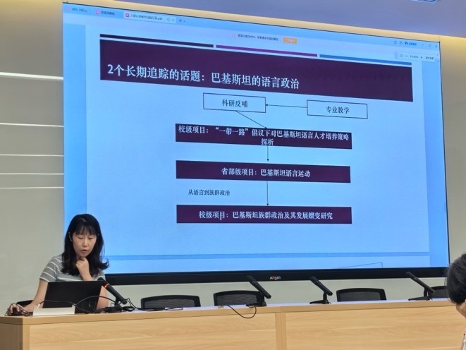 全体教师理论学习环节,pg游戏电子模拟器两位教师乌尔都语袁雨航老师和孟加拉语曾琼教授分别进行了题为“入职以来教学经验分享”“社科基金立项简况”的发言。两位老师结合自身丰富的教学、科研经历从人才培养、课堂教学、课题申请等不同角度,分享了学术科研与专业教学的实践与经验。