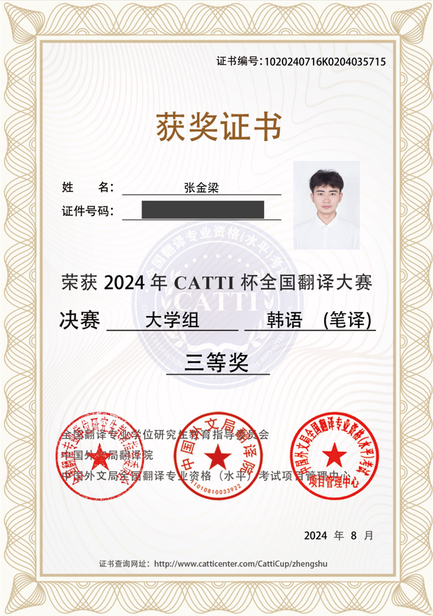 在张金梁同学参加的大学组比赛中,参赛者有来自国内外高校的在读本科及硕士、博士学生,张金梁同学作为本科学生获得国家级三等奖,充分展示出了过硬的专业能力,也展现了pg游戏官网朝鲜语专业作为一流本科专业的优秀教学水平。