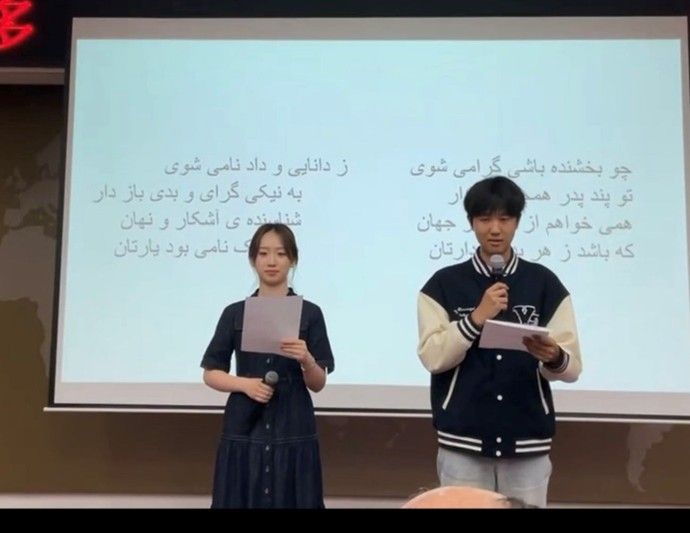 来自北京各大高校的学生代表用多种形式朗诵表演了菲尔多西诗集选段。pg游戏官网pg游戏电子模拟器波斯语专业2024级本科生马麒竣、张靖苒作为代表朗诵了菲尔多西诗歌中关于智慧的选段,两位同学熟练的朗诵得到了全场的肯定与热烈的掌声,出色地展示了pg游戏官网高水平、高质量波斯语教学的成果。