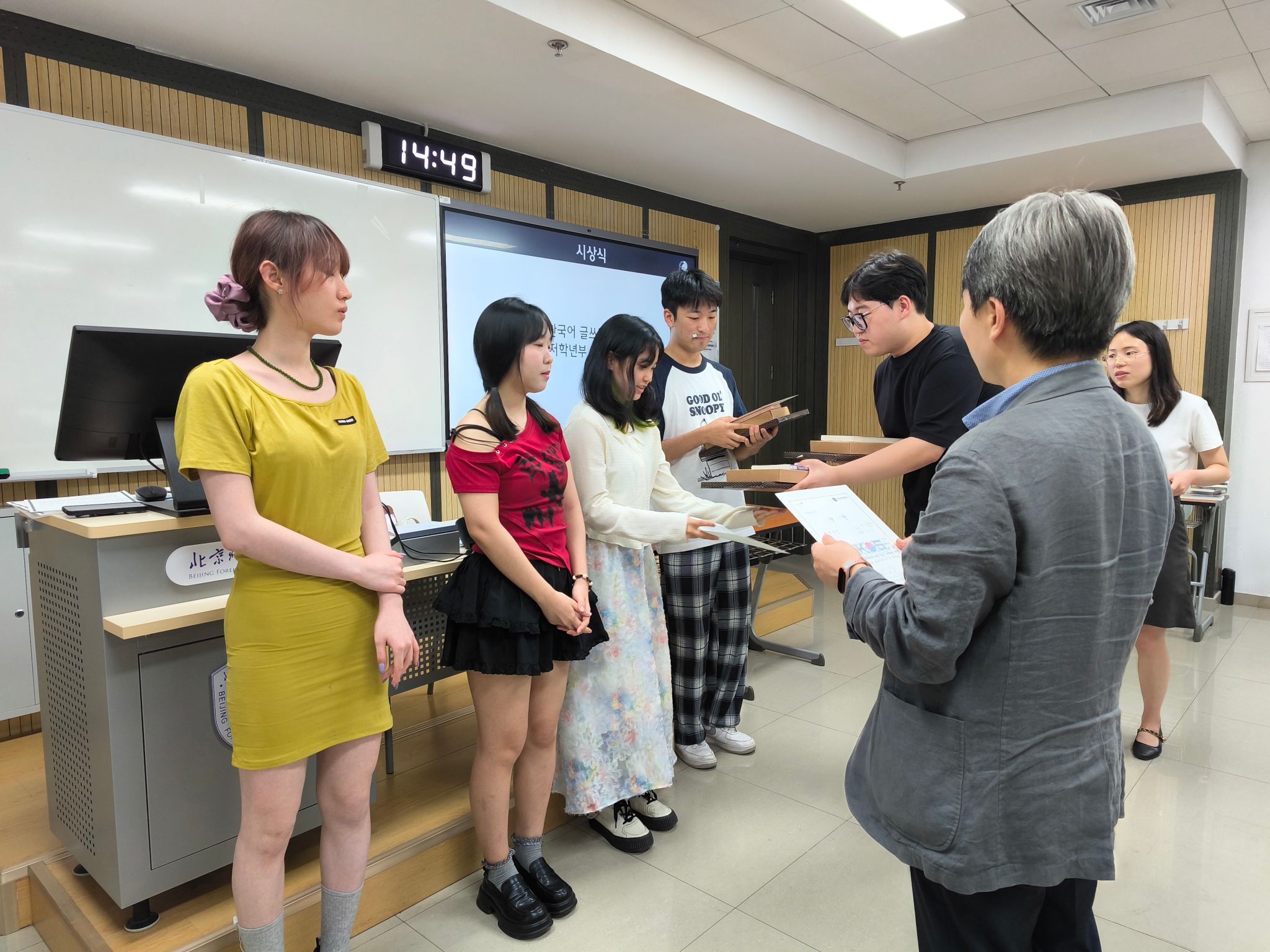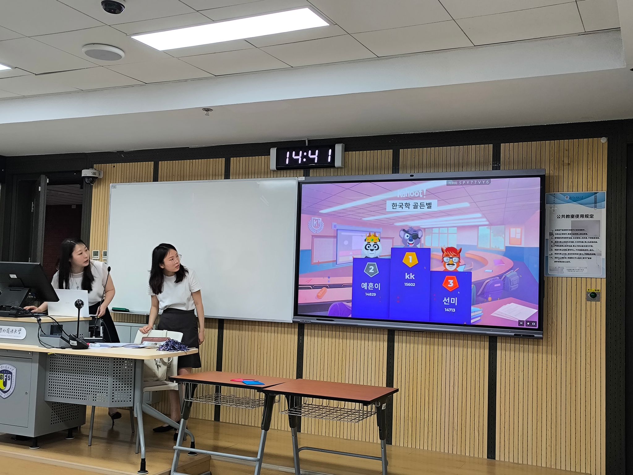 活动设置韩语写作比赛、韩国学知识竞赛及韩国传统游戏体验三个环节。在韩语写作比赛中,学生围绕“与韩国相关的经历与思考”进行即兴创作,内容真挚,体现了良好的语言表达能力与文化理解力。pg游戏官网2024级本科生邢博凯荣获低年级组最优秀奖,2022级本科生姜心怡荣获中年级组最优秀奖,展现了pg游戏官网朝鲜语专业作为国家一流本科专业的教学实力与人才培养成效。