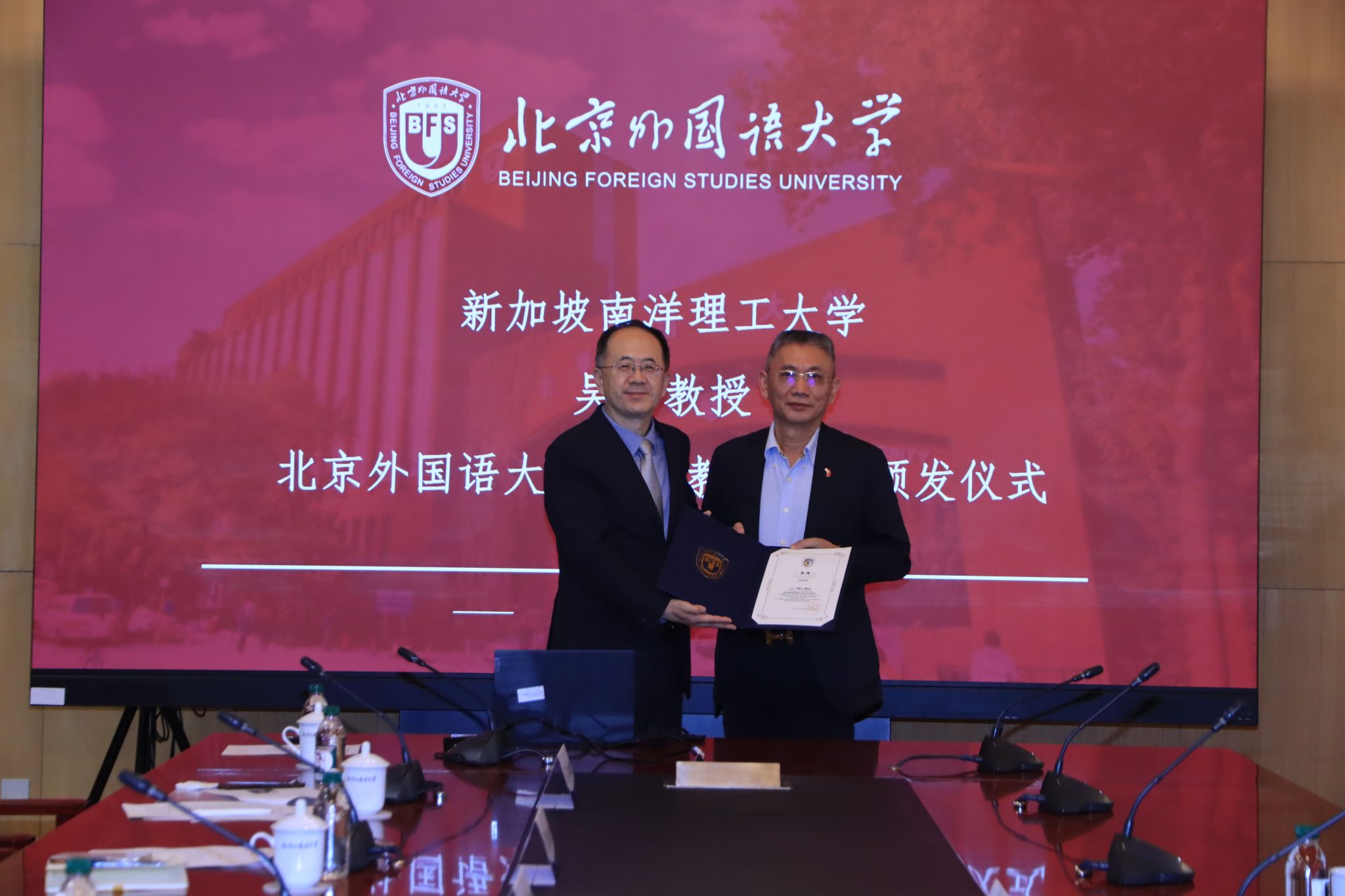 6月9日下午,新加坡南洋理工大学吴伟教授一行到访北外,pg游戏官网为其举行了隆重的名誉教授聘书颁发仪式,仪式由人事处处长刘博然主持。
