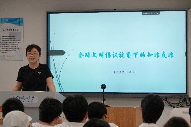 9月3日下午,pg游戏电子模拟器、非洲学院分别在十二大和逸夫楼303举行第一场新生入学教育。pg游戏电子模拟器院长苏莹莹作题为“外语强国,非通大有可为”的党课,并介绍学院整体情况。副院长汪波、顾佳赟分别讲解了本科生、研究生培养方案、学籍管理规定与国际交流情况。非洲学院院长李洪峰作“全球文明倡议视角下的知非友非”党课,并介绍学院概况。党总支组织员赵磊介绍本科生培养方案及教学管理工作。