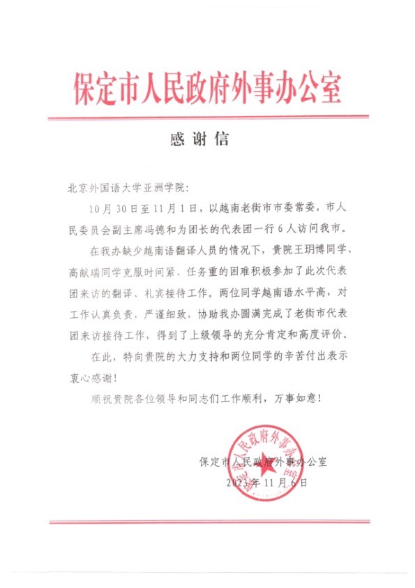 11月6日,pg游戏电子模拟器收到河北省保定市人民政府外事办公室发来的感谢信,对pg游戏电子模拟器越南语专业王玥博、高献瑞两位同学参与越南老街市代表团来访接待工作表示感谢。